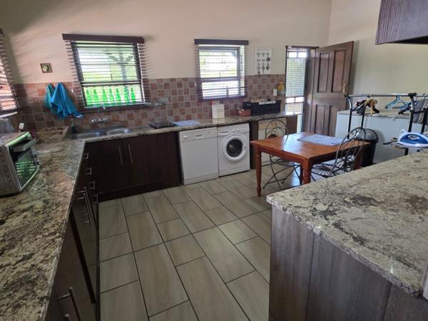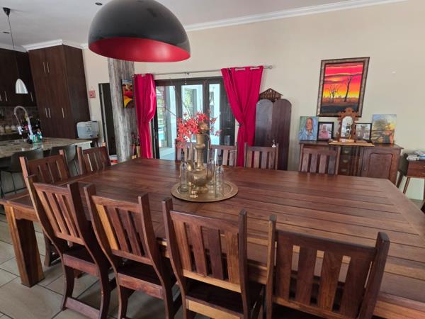 Step inside to an interior bathed in natural light, featuring soaring high ceilings and an expansive open-plan layout. The seamless flow between the inviting living and dining areas, complemented by sleek tiled flooring, creates an ideal environment for both grand entertaining and serene family life. A well-appointed kitchen, boasting modern cabinetry and generous counter space, caters to every culinary desire, while a dedicated braai room promises delightful gatherings.