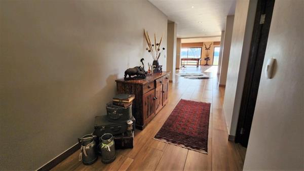 The spacious living area connects to the braai area with stack glass doors making it ideal for entertaining in the braai area with its built-in braai and bar with ever changing sunset views.
