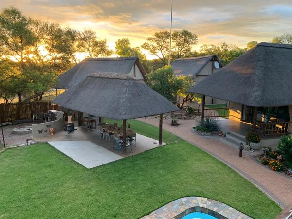 The house and 3 cottages share a beautiful sparkling swimming pool, thatched communal Lapa, and boma.