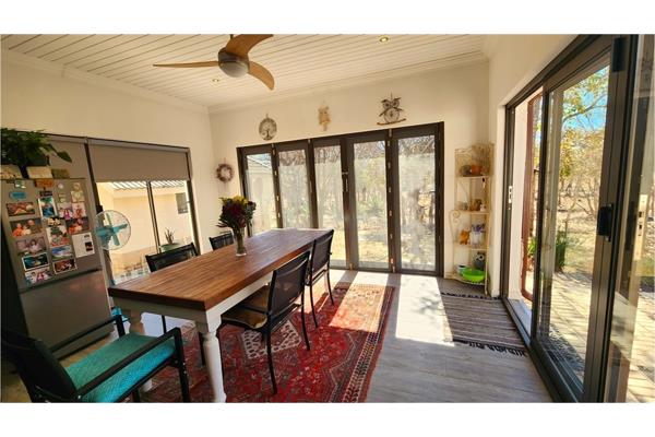 The welcomingsun patiowith stacker doors opens seamlessly to the outdoors, creating the ideal space for entertaining or simply enjoying the tranquil bushveld views. Inside, thespacious open-plan living areaboasts air conditioning and a ceiling fan, flowing into a well-appointed kitchen with a gas hob and electric oven.