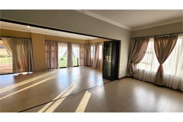 Step inside to a spacious, open-plan living and dining area that flows into a sleek modern kitchen with two ovens, a gas hob, and a separate scullery and laundry. The dining area opens via stacker doors to an enclosed entertainment space with a built-in braai and prep area, as well as a covered patio perfect for relaxing outdoors.