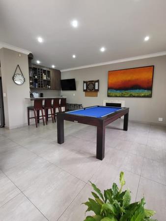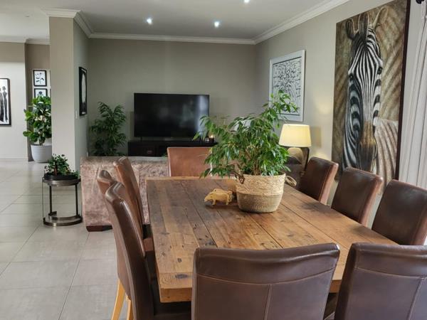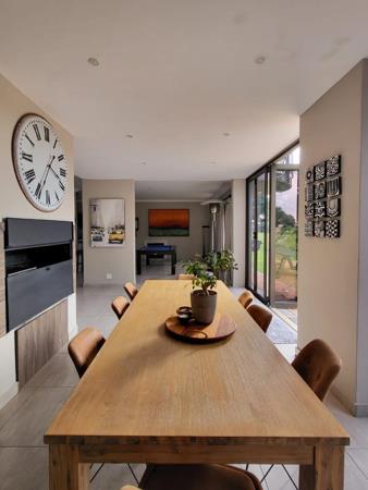 Large stacking glass doors open onto the covered patio, revealing a sparkling pool and boma areaperfect for sundowners or family gatherings overlooking the golf course. Its both an entertainers dream and a private retreat.