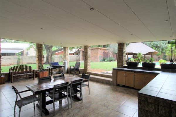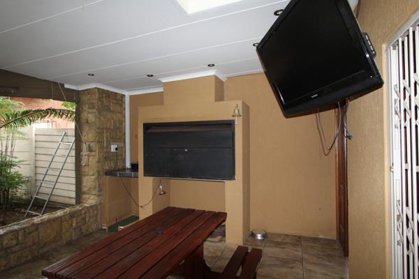 The lounge opens up to the covered patio with a built-in braai and bar-room to the side. There is also a guest toilet for your guests convenience.