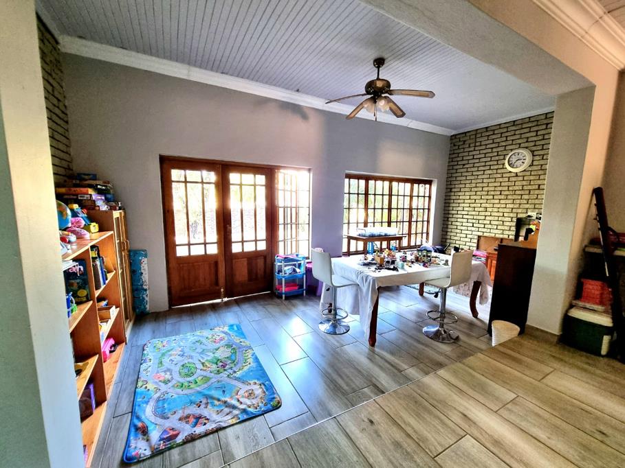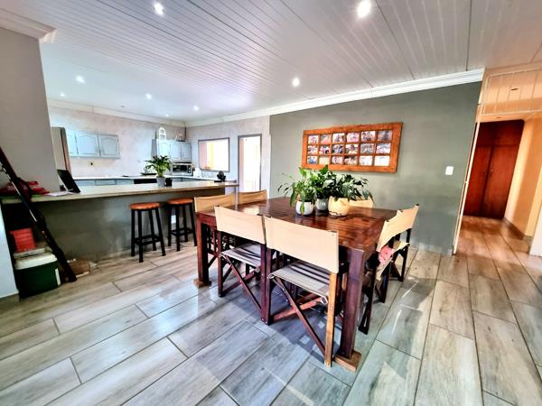 Outside, a paved driveway leads to a spacious double garage with ample storage space. At the rear of the garage are staff quarters. The property also features a swimming pool with a poolside entertainment area that includes a built-in braai. A backup water tank with a pressure pump ensures water availability, and the garden is fully irrigated.