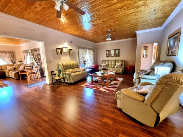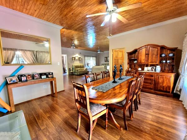 The first house, enclosed within its own fenced area, presents a spacious four-bedroom layout designed for comfort and relaxation. Upon entering through the main entrance, you''re greeted by an inviting first living room, seamlessly connected to an open-plan design. Through a secondary door lies a deck offering picturesque views of a seasonal dam in the distance. Adjacent to the deck, a swimming pool and a braai area with a boma provide ample space for outdoor entertainment. Continuing from the first living room, a larger second living room and dining area await, accompanied by a convenient guest toilet. Additionally, a study equipped with a built-in desk and ceiling fan, along with a small storage room, offer practicality and organization. The main bedroom features a ceiling fan, walk-in closet, and en-suite bathroom, while the second living room opens onto a spacious deck overlooking a lush garden with fruit trees and garden irrigation. The kitchen, seamlessly integrated into the open-plan layout, boasts modern amenities including an electric hob and oven, complemented by a generous dining area. A separate scullery and laundry room provide convenience, with direct access to a three-car garage and ample storage space. A hallway leads to three additional bedrooms, each complete with ceiling fans, built-in cupboards, and en-suite bathrooms, with one bedroom featuring a built-in desk. Outside, a driveway leads to a three-car garage and a large carport suitable for additional vehicles or a caravan, alongside a tandem double carport and a separate boma and braai area in the garden.