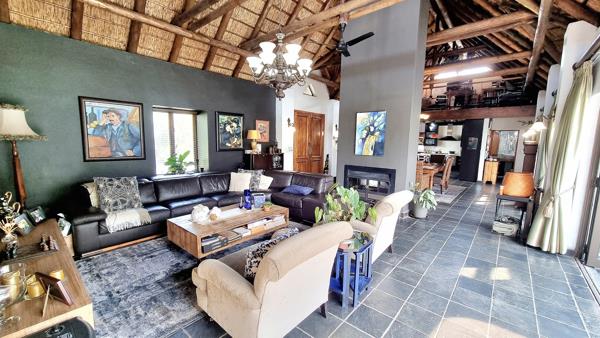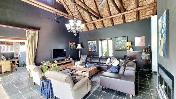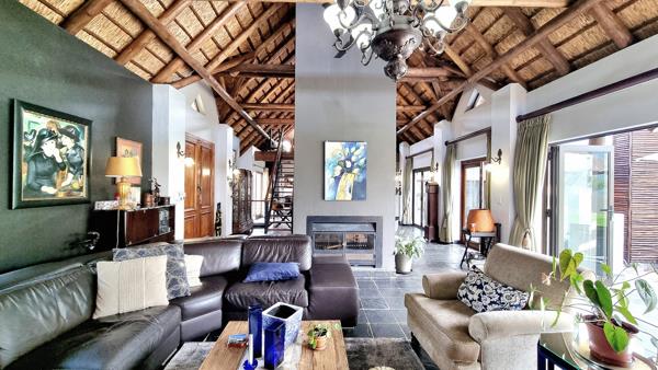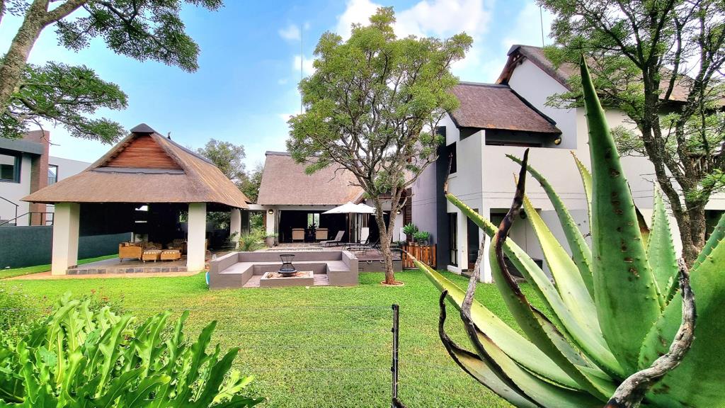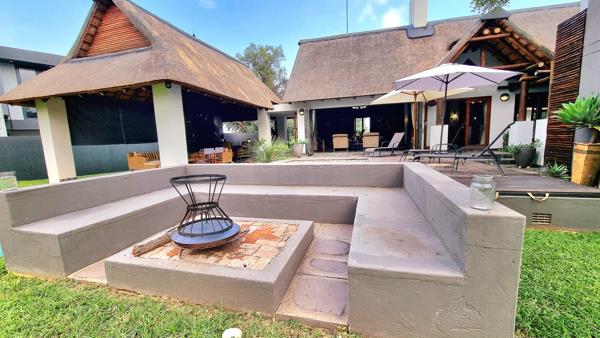 Experience the ultimate in luxury and sustainability with this solar-powered Bushveld sanctuary. Situated in the prestigious Koro Creek Golf Estate, Modimole, this thatched-roof lodge is positioned on a hill, offering unparalleled privacy and breathtaking panoramic views over the golf course and treetops from the second story.