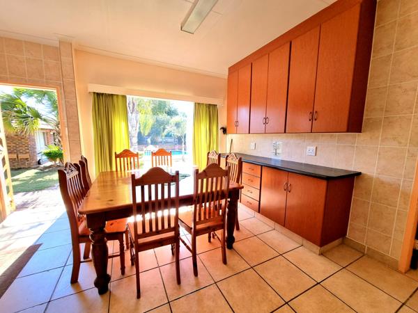 The home features a spacious living room and a separate TV room, providing ample space for relaxation and quality family time. The open-plan dining room and kitchen create an inviting atmosphere, perfect for hosting memorable gatherings with friends and loved ones. Adjacent to the swimming pool, you''ll find an enclosed entertainment area, complete with a built-in braai, where you can enjoy delightful moments and create cherished memories.