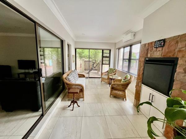 Closed Entertainment Patio Ideal for year-round use, featuring a built-in braai and sliding doors that open to both the lounge and outdoor area.