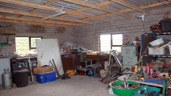150m² motorhuis met groot elektriese deur, werkswinkel en ekstra stoorplek.