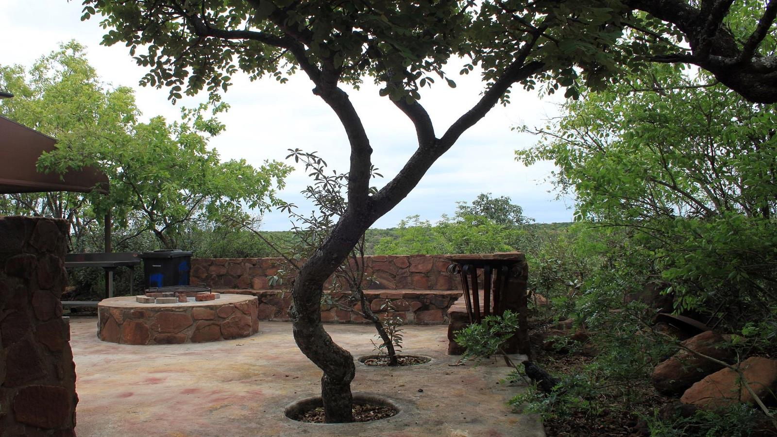 ''n Hoogliggende lapa met braaiplek kyk uit op golwende Waterberg rante. Plaspoel. Lieflike inheemse Bosveld bome en struike versier die Waterberge sover as die oog kan sien.