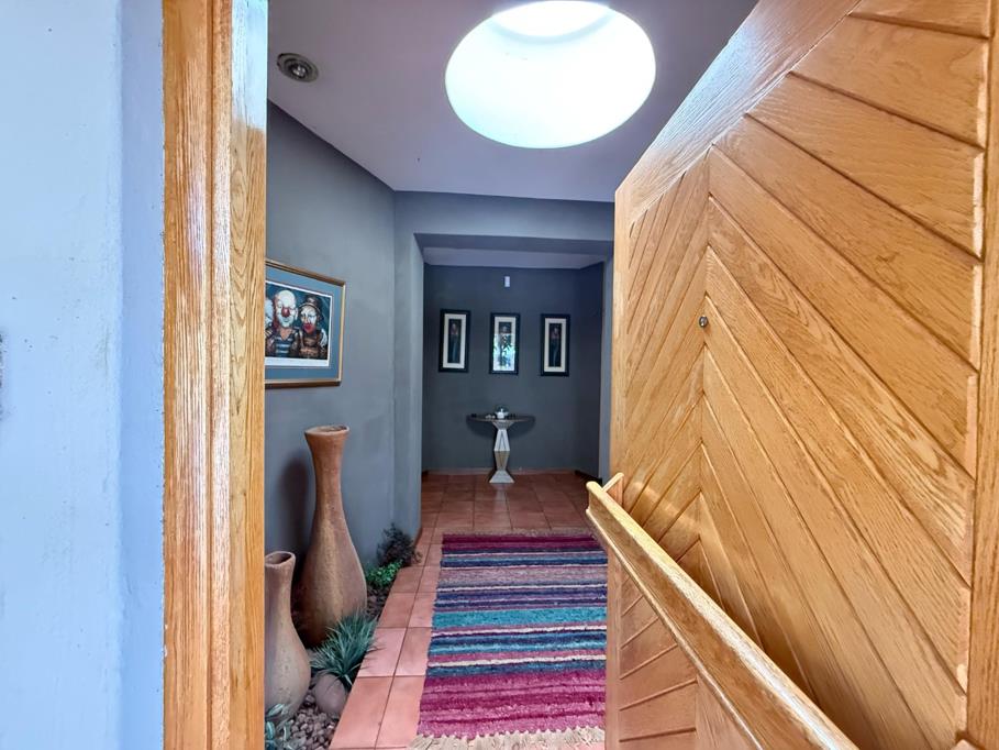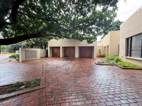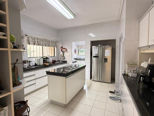 The modern kitchen features a pantry, scullery, and separate laundry room, with a convenient sliding door to close off the TV room for added privacy. Outside, a lush, expansive garden surrounds the sparkling swimming pool all kept green and thriving with a borehole and irrigation system.