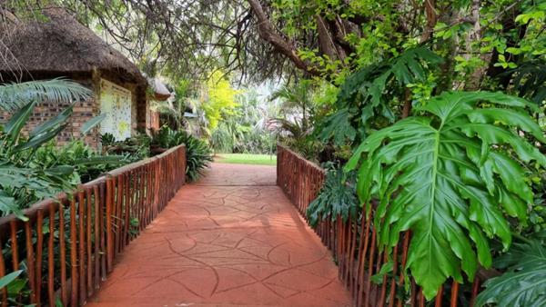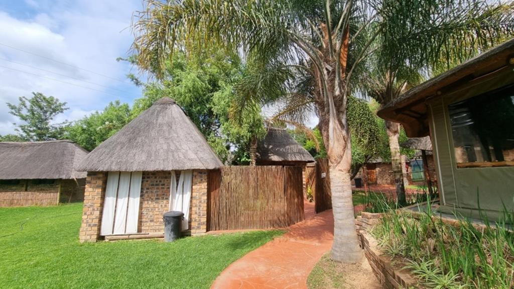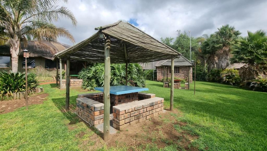 Entertainment Area: This area has a large thatch roof Restaurant area with a Bar, industrial kitchen, cold room as well as some storage rooms. There is a Curio Shop with an Office area. The outside has shaded dining areas overlooking a large dam. There is a Swimming Pool area with Water slides, Toilets and lush green lawns.
