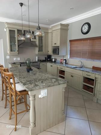 The home features a welcoming entrance hall, a spacious lounge, dining area, and a TV room, all designed for family living and entertaining. The modern kitchen is both stylish and practical, fitted with quality finishes, while large windows allow natural light to flow through the home. A wide stoep (veranda) opens out onto the deck and swimming pool, creating a perfect space for relaxation and enjoying the tranquillity of nature. The home also includes two garages, neat plastered and tiled finishes, and is offered unfurnished, giving you the freedom to make it your own.