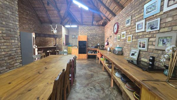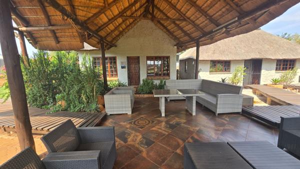 The 4-Star self-catering thatch-roofed lodge on the property features three chalets with En-Suite and sharing bathrooms which can accommodate 11 sleeping guests, an open-air shower and bathroom, all equipped with gas geysers, communal kitchen with all necessary cutlery, crockery, eye-level oven, desktop stove, microwave and so forth. Large dining area with TV and poolside bar, two splash pools with water slides, duck pond, Kiddies play area, Junior rugby field (60m x 30m) with established and cultivated Kikuyu grass and professional developed 9-hole mini golf course with proper putting pitches and illuminated by solar-powered spotlights. The golf course and rugby field are being irrigated through solar-powered systems. Furthermore, a shed including slaughtering and cooling facilities, etc. The whole 3ha. lodge area is enclosed with electrified security fence and covered by CCTV cameras and alarm systems.