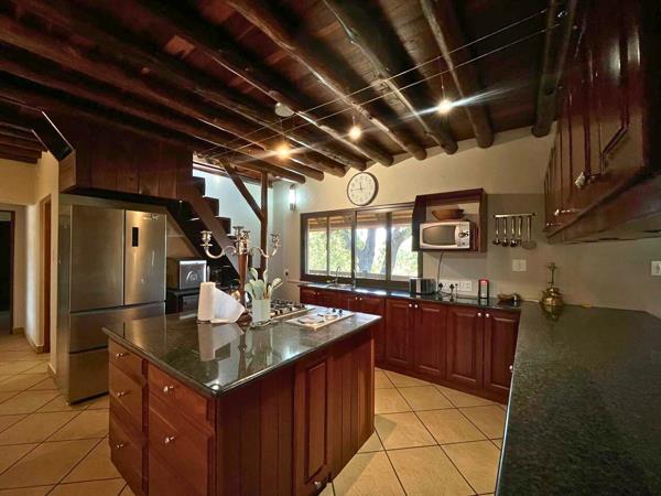 Outside, enjoy a large patio with a solid wooden 12-seater table and built-in braai, an inviting swimming pool, a boma with concrete seating, and parking for five cars. The double garage has internal access for convenience. Plus, the home is solar powered and comes with a 5,000-litre water tank, making it practical as well as beautiful.