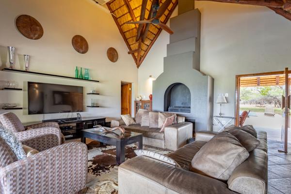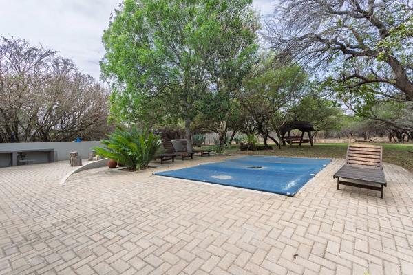 On the lower level, youll find two additional en-suite guest rooms, a bar and entertainment area, laundry, storeroom, and staff accommodation. This level opens out to a second covered patio with built-in braai, overlooking the sparkling swimming pool, boma, and a beautifully landscaped garden where wildlife frequently visits the private waterhole.