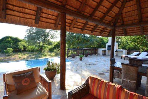 It consists of a large covered patio, expansive paved deck with large swimming pool, braai area and a separate boma area just off the patio.