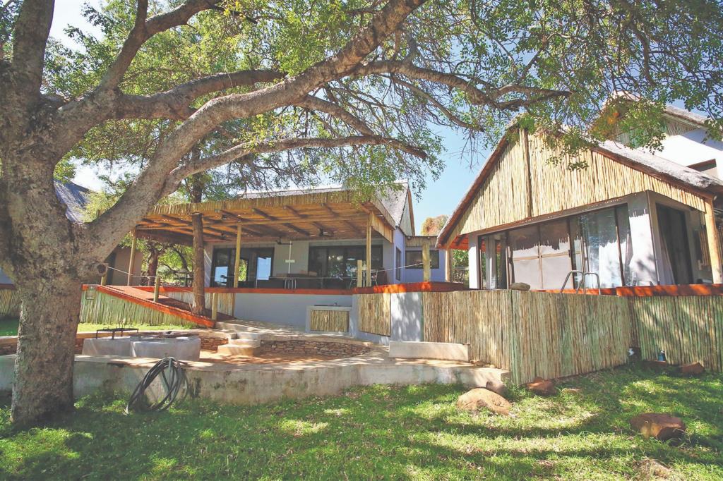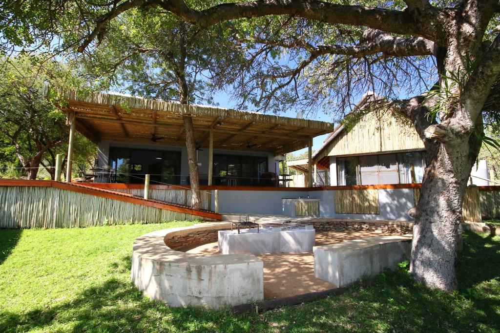 * Large river-facing patio with fire pit and braai area, shaded by a Marula tree