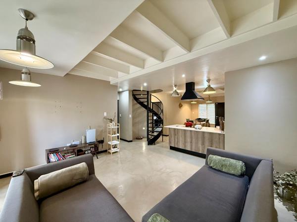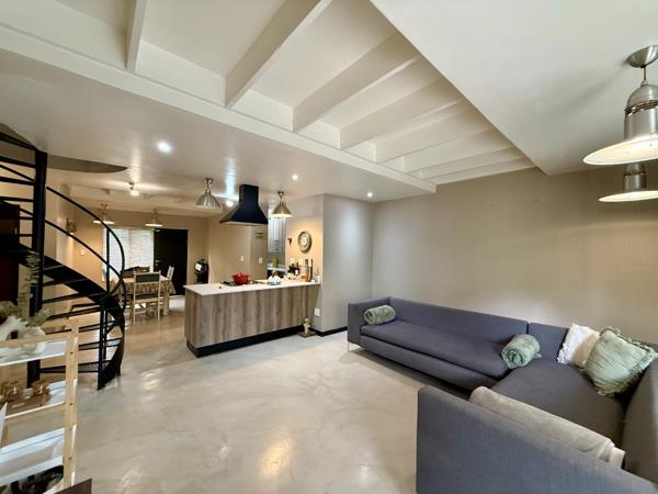 Step inside to discover an inviting open-plan living, dining, and kitchen area, characterized by a modern industrial aesthetic. High ceilings with exposed beams and polished concrete-look flooring create an airy, sophisticated atmosphere. A striking black spiral staircase serves as a unique architectural feature, while the contemporary kitchen island, complete with an integrated hob, forms the heart of this vibrant space. Air conditioning ensures year-round comfort.