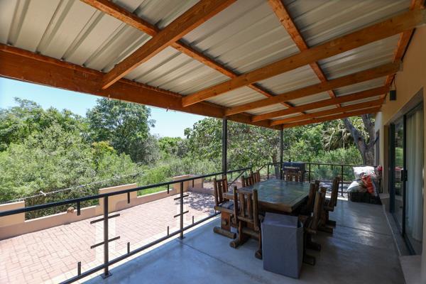 Outdoor living is a highlight, with a spacious covered patio offering an ideal setting for entertaining or simply enjoying the scenic views and lush garden. The property also features a refreshing pool, perfect for warm South African days, and extensive paving for convenient off-street parking on the generous 2500 sqm erf. A dedicated storage area adds to the practicality of the home.