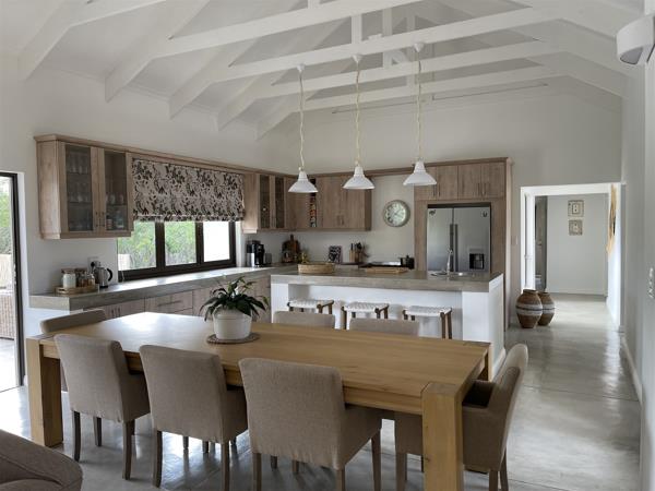 The open-plan lounge and dining area lead out to the covered patio with private views of the surrounding bushveld. The kitchen has a center island, making cooking and entertaining a breeze. There is also a separate scullery that goes out to the courtyard and wash-line.