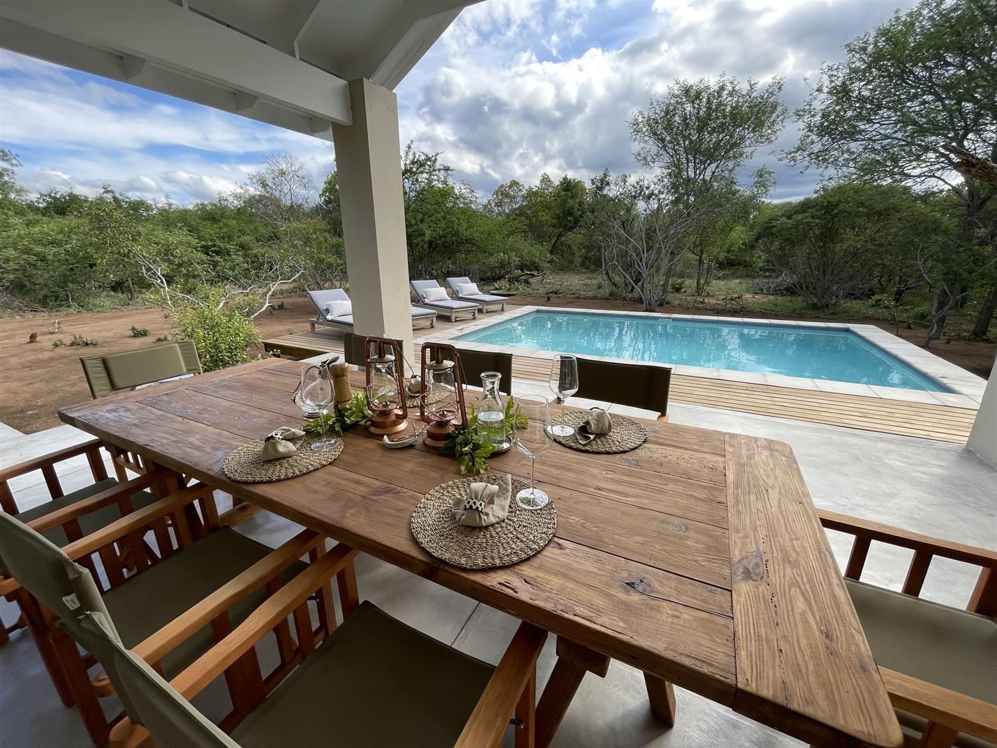 A modern bush home is situated in a quiet area in Moditlo Estate, which has a lot of game activity. You can wake up to elephants drinking from your pool or lions in your front garden. Moditlo is home to four of the big five animals, as well as cheetahs, wild dogs, hyenas, and plains game.