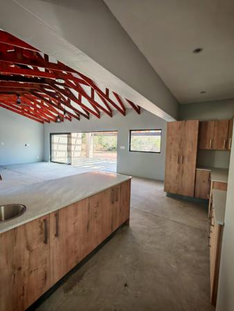 The home features a generous open-plan lounge and kitchen with modern screed flooring, while a separate scullery adds to the functionality. High, exposed rafters in the living area create a sense of space and openness, enhancing the natural charm of the setting.