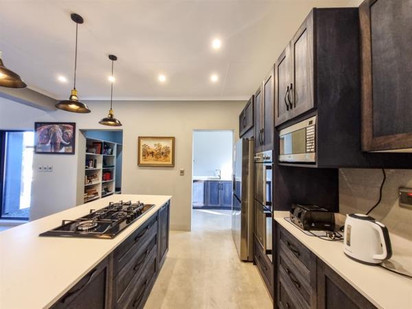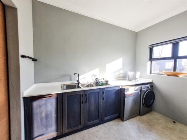 Located in the peaceful Moria section of Moditlo Estate, this newly constructed, partially furnished residence, offers low-maintenance, contemporary living. The open-plan living space includes a lounge, dining area, and kitchen. The kitchen features a gas stove top, double oven with an integrated air fryer, and a connected scullery with space for a dishwasher and washing machine, along with a pantry.