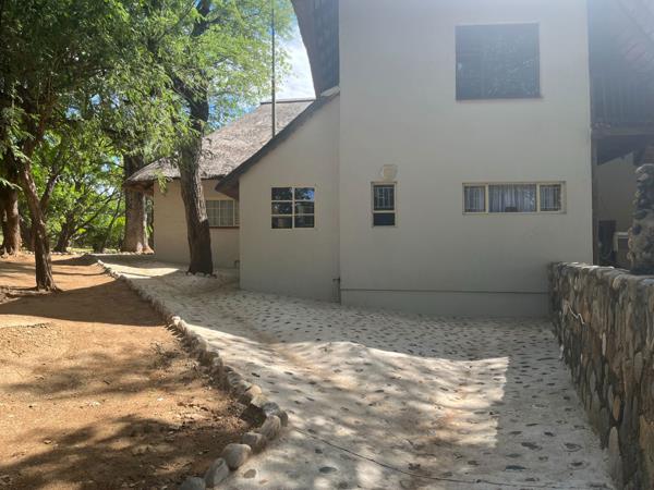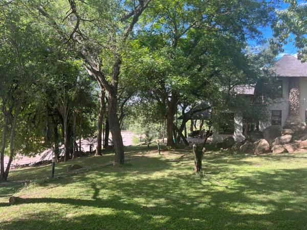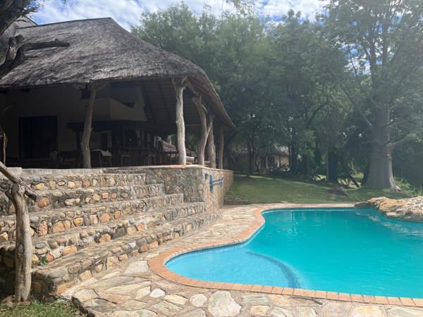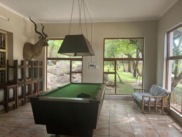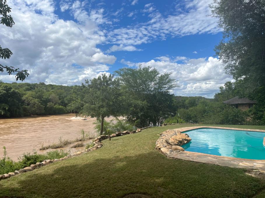 The outdoor entertainment area, with stunning river views, includes a generous undercover patio and a boma with a built-in braaibarbecue, surrounded by towering treesideal for hosting large gatherings while watching hippos in the river. A sparkling swimming pool offers a refreshing retreat during warm summer days.