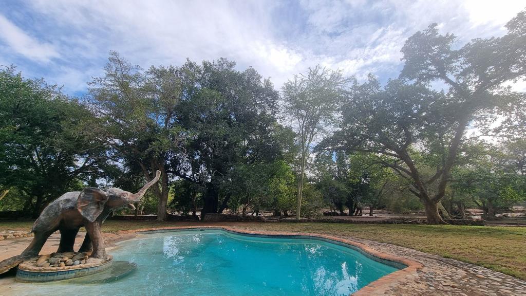 At the heart of the property is a massive outdoor entertainment area designed for hosting under the African sky. This thatch-covered space includes a built-in braai, fully equipped bar, and generous dining area, all positioned to take in sweeping views of the rolling lawn, mature trees, and the meandering Oliphants river beyond. A sparkling swimming pool completes the scene, with the garden stretching down toward the rivers edgea perfect setting for hot summer days and unforgettable sunsets.