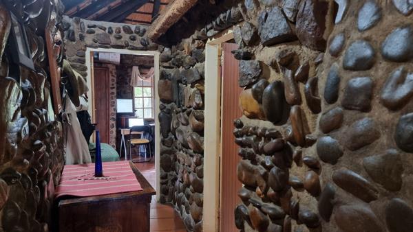 The homestead features two beautifully crafted cottages built from natural river stone and topped with thatched rooves, seamlessly blending into the landscape. Each cottage offers two comfortable bedrooms and a shared bathroom, perfect for family getaways or guest accommodation. One of the cottages boasts a spacious open-plan lounge and kitchen, ideal for relaxed, communal living.