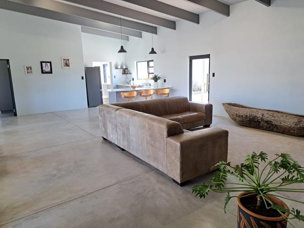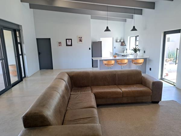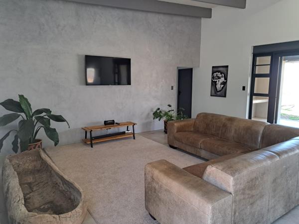 As you step inside, you''ll be greeted by an open-plan living space that seamlessly integrates with the outdoor surroundings, creating a harmonious flow throughout the home. The living areas have high ceilings and two ceiling fans. The state-of-the-art kitchen features top-of-the-line appliances and sleek finishes, which are ideal for culinary enthusiasts and entertaining guests, boasting a 5-burner gas oven and hob. The separate scullery has enough space for 3 appliances, a double washbasin and ample cupboard space. Outside you will find the courtyard with a safety cage for 2 gas bottles. The courtyard leads to the roof-covered double carport with additional parking space.
