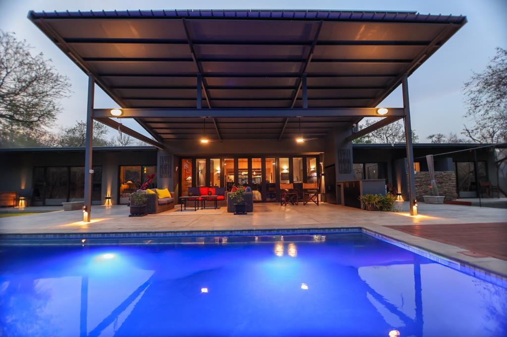 Outdoors, the home continues to impress. A sizable infinity-edge pool finished in premium Cemcrete Moroccan plaster serves as a focal point for relaxation, enhanced by an 18kW dual inverter heater with programmable Wi-Fi controls. The 25 m concrete boma sits on the riverbank, providing an idyllic setting for evenings by the fire or entertaining under the stars. The landscaped gardens are lush and meticulously maintained, with front and rear lawns, irrigation systems, pathway lighting, and mature trees that create a peaceful, private environment.