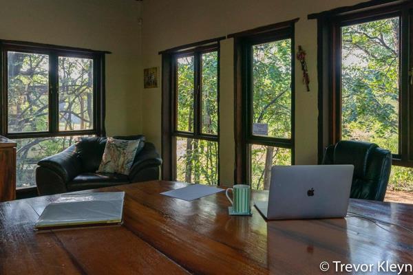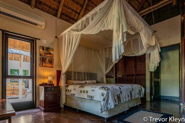The distinctive thatch-roof architecture, complemented by rustic wooden pillars and light-colored walls, creates an inviting kerb appeal that harmonizes with the lush natural surroundings. Set on a generous 1.19-hectare erf, the property boasts expansive, well-maintained lawns where impala are frequently seen grazing, offering an unparalleled safari-like experience right at your doorstep.