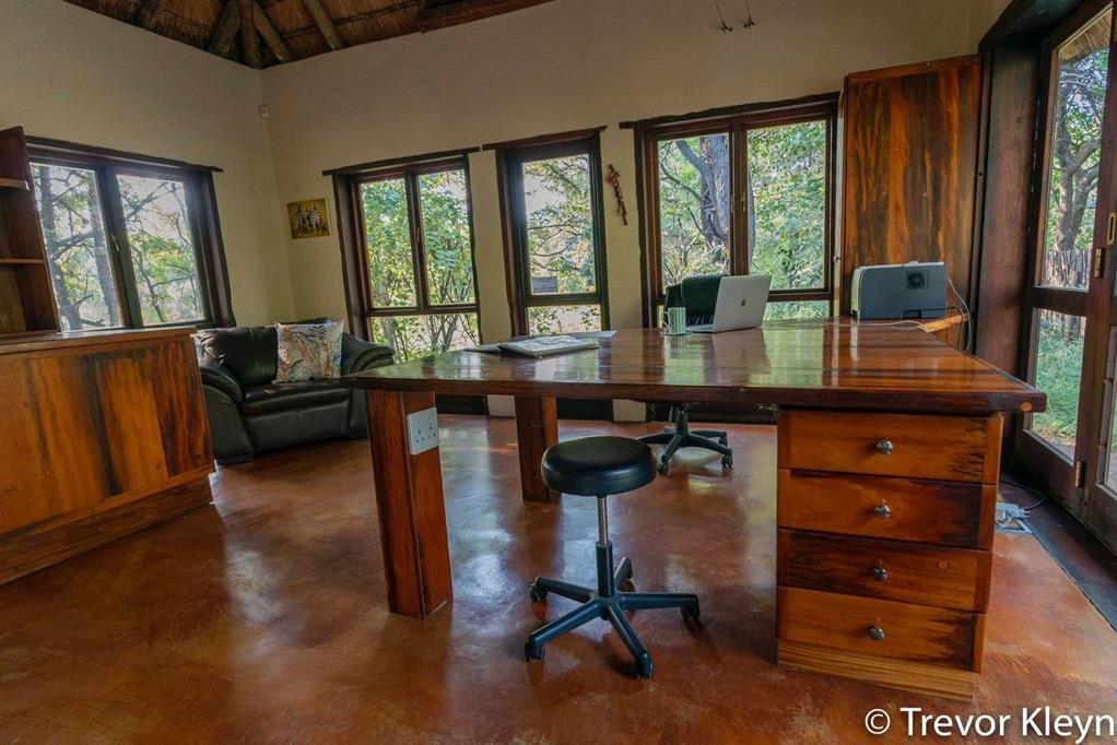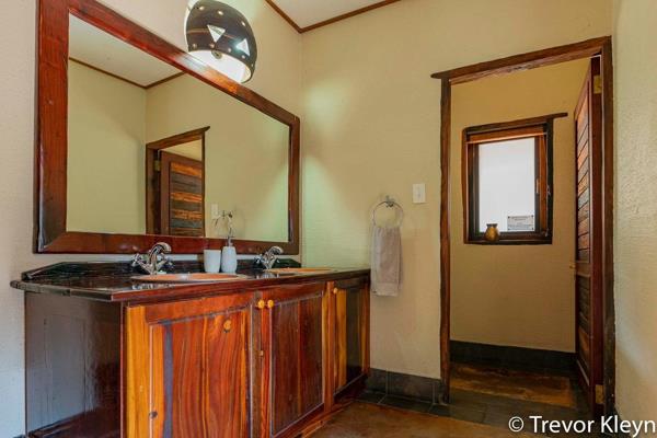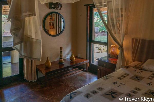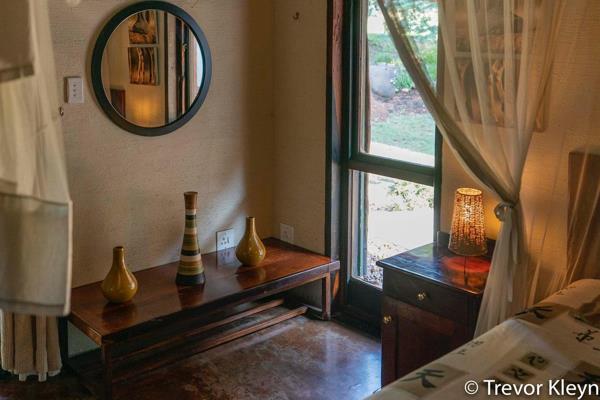 Inside, the residence features an open-plan design, encompassing two spacious lounges and two dining areas, providing ample room for relaxation and entertaining. The property includes two kitchens, offering versatility and convenience, ideal for dual living arrangements or accommodating guests within the integrated flatlet. Interiors showcase a rustic aesthetic with natural wood finishes and, in some areas, charming thatched ceilings, creating a warm and authentic ambiance.