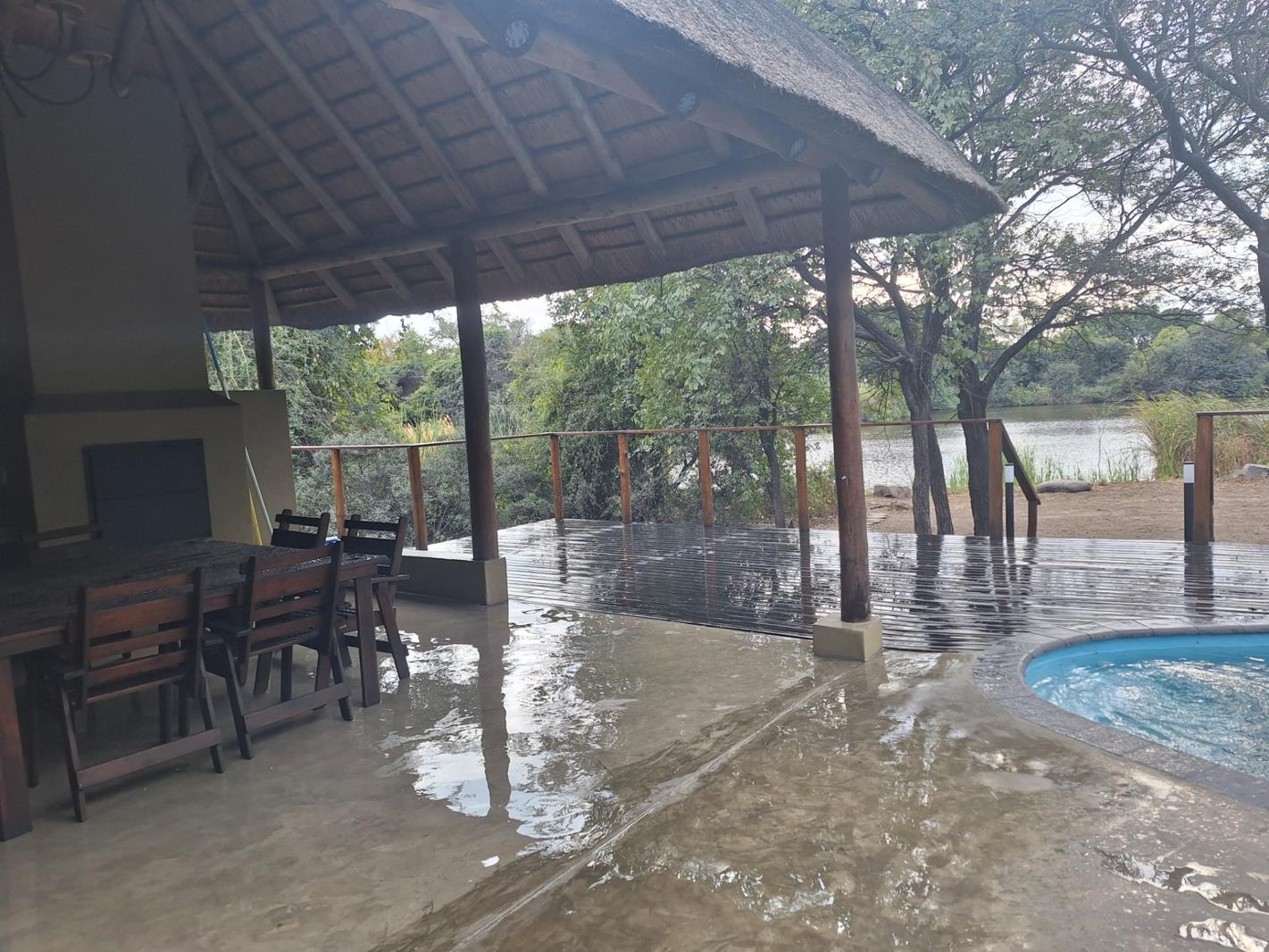 The open-plan dining/lounge has glass doors that open onto the deck and swimming pool/braai area. Stairs from the wooden deck/patio lead to the dam. The deck features an open shower.