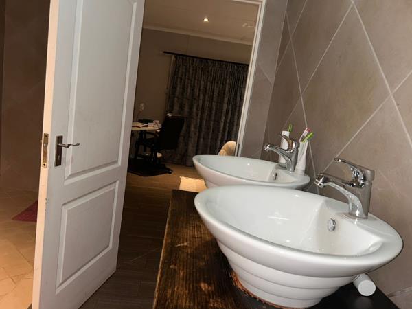 The house has three bedrooms and three bathrooms. The main bedroom is spacious with a walk-in cupboard. The en-suite bathroom has a walk-in shower, a bath, a double basin, and a toilet. The second bedroom has an en-suite bathroom with a shower, basin and a toilet. The third bedroom also has an en-suite bathroom with a shower, basin, and a toilet.