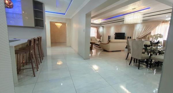 Descending to the lower level, one finds a well-appointed space that seamlessly combines functionality with luxury. The entrance hall flows effortlessly into an expansive open-plan lounge and dining area, ideal for relaxation and entertainment. The modern kitchen and scullery, characterized by high-gloss cabinets, not only enhance the sense of space but also ensure a bright and welcoming environment. This level also features two generously sized bedrooms, one with a walk-in closet and tastefully designed ensuite bathroom.