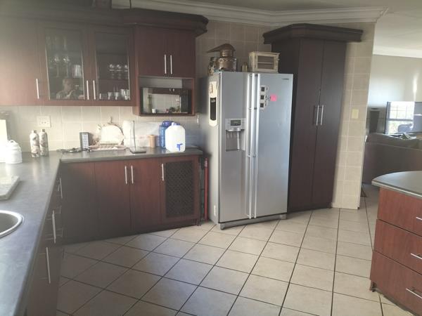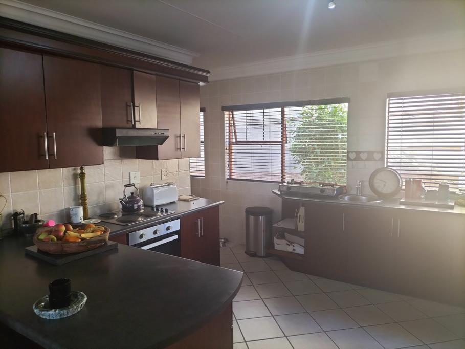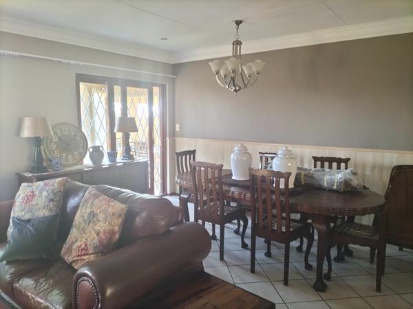 This double-story house has 3 bedrooms, 3 bathrooms, an open-plan lounge, a dining room, and a fitted kitchen with a scullery/laundry. The property also has 2 garages, 2 carports, a small garden, a JoJo tank, a balcony, and a braai area.