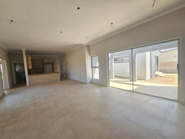This brand-new home has space upon space and is spacious. Lets walk through the home: your front door leads you into your open plan living, dining and kitchen area. There is a guest toilet so that when you entertain, guests can remain in the main part of the home. The kitchen has lots of counter as well as cupboard space. The rest of the cupboards through out the home is just the same, lots of space. The pantry all organisers dream of and your scullery is the right size and on the right place tucked neatly away to hide your mess. The bedrooms are all on one side of the home. Your first bedroom is an en-suite with a sliding door. The next 2 bedrooms are very interesting, they both share the same bathroom and are ideal for your children to share this bathroom. The main has a walk-in cupboard, as well as a spacious main-en-suite. Your main bedroom has also a sliding door that opens up onto your spacious garden. The entertainment is on your patio next to your living area, with a built-in braai. The double door garage is spacious and walks into your scullery.
