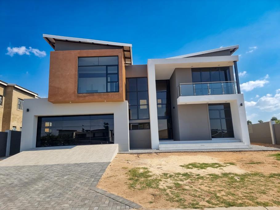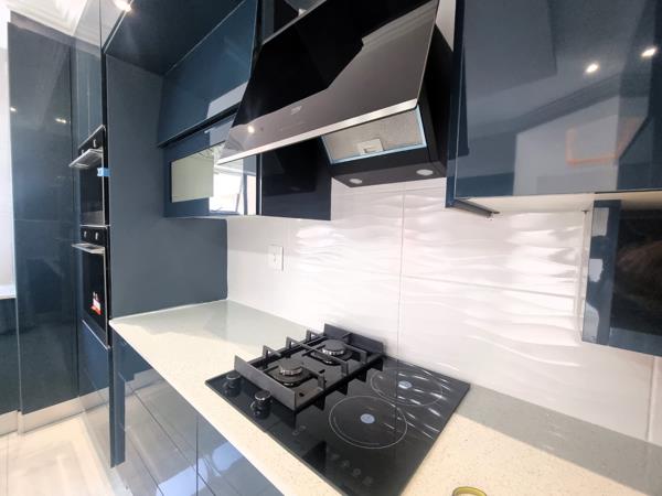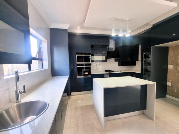The gleaming kitchen is a culinary masterpiece, featuring a shiny waterfall island, ample cupboard space, floating shelves, an electric and gas stove, two oven spaces, and a convenient basin. The adjoining scullery, with its abundance of cupboard space, leads to an outdoor garden area.