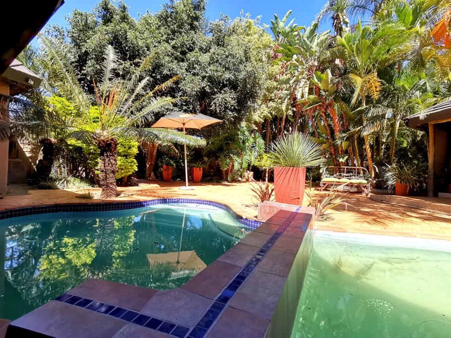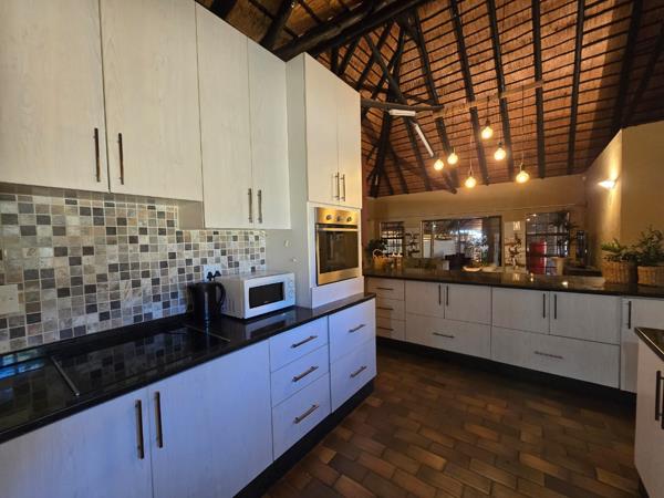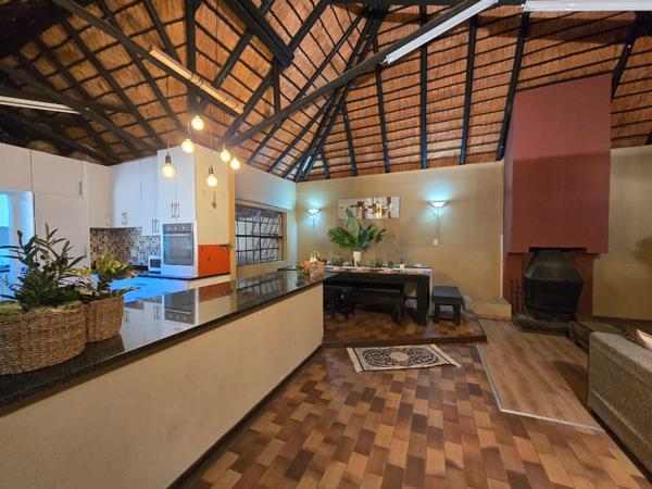 Step outside to the expansive garden, where youll find a well-maintained pool and koi fish pond, perfect for relaxation and entertainment. The garden is lush and full of palm trees, offering a serene and private retreat right in your own backyard. The communal area is ideal for use as an office or relaxation space, offering plenty of room to work or unwind. The property features a thatched roof, giving it a charming and rustic feel. The double carport provides ample space for parking, while the electrical fencing and motor gate offer additional security and peace of mind. The washing area under a roof allows for convenience in managing laundry, and theres a separate domestic bathroom to cater to the needs of household staff.