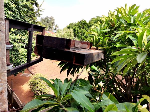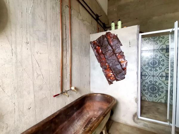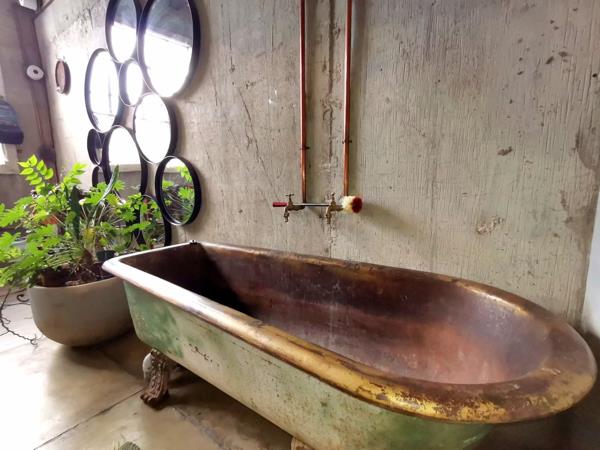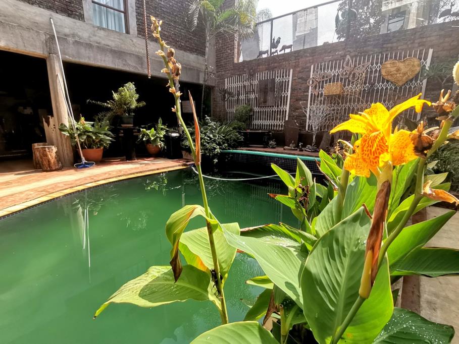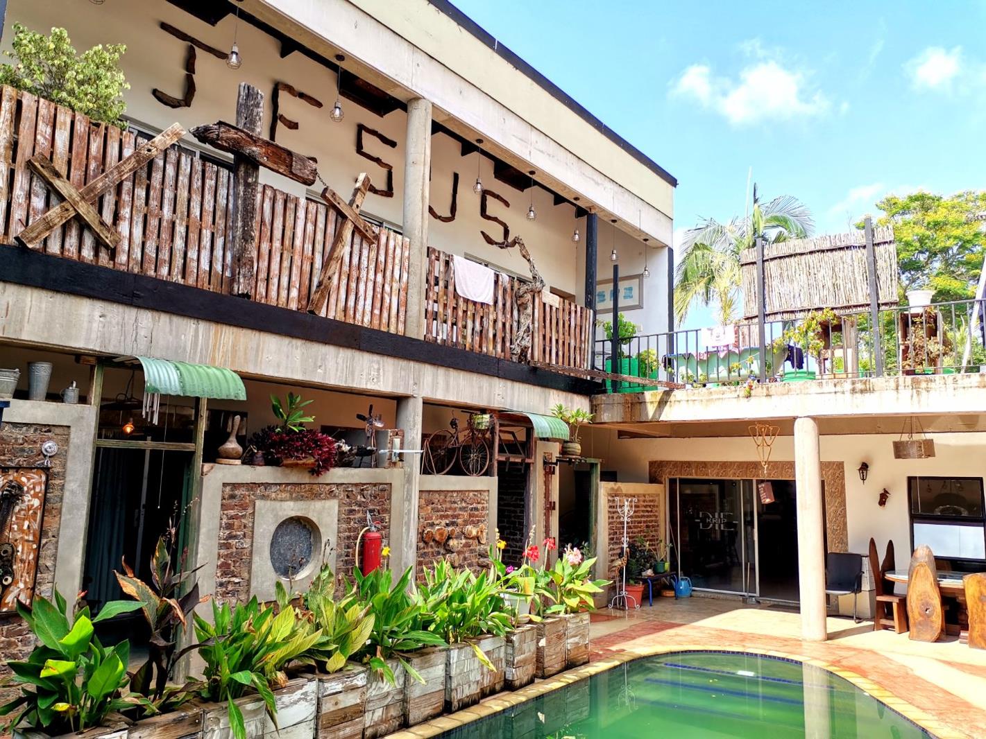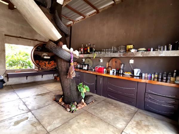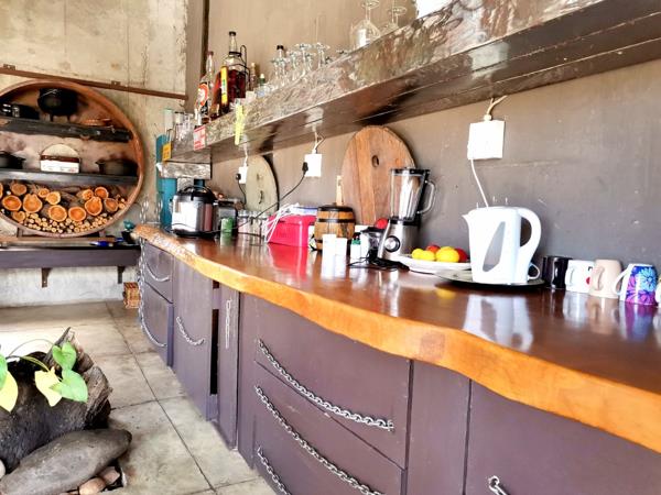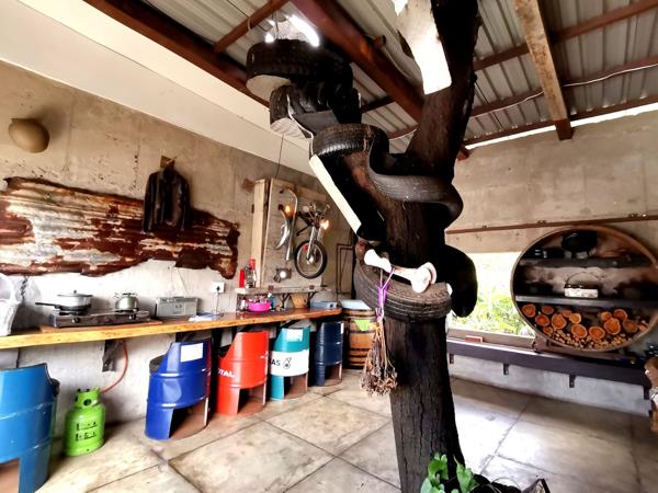 Step into the main building, where creativity meets comfort. Upstairs, you''ll find a spacious bedroom featuring a hanging bed and an en-suite bathroom that exudes a rustic style. The bedroom leads out to a private balcony, perfect for relaxing with a braai area and views of the surrounding area. The open-plan kitchen is truly unique, with a tree growing through the middle of the room, adding to the property''s rustic yet contemporary feel. Enjoy the pull-out braai area and custom-designed motorcycle light fixtures, creating an ambiance like no other.
