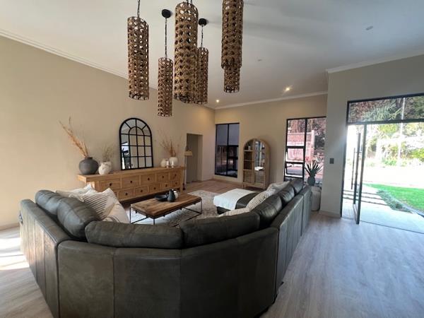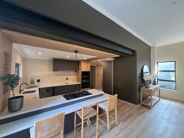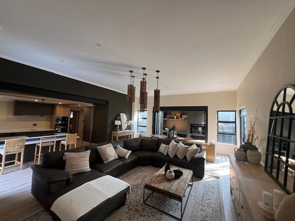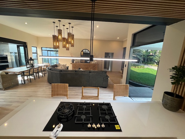 Once you enter the property you are greeted with a massive glass door, open plan lounge and dining area that flows to an elegant braai area. The MasterChef kitchen has bespoke appliances and has a gas hob, oven and microwave oven. There is a scullery as well to do all the washing. The property has wooden laminated flooring to make cleaning easy.