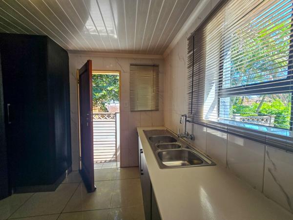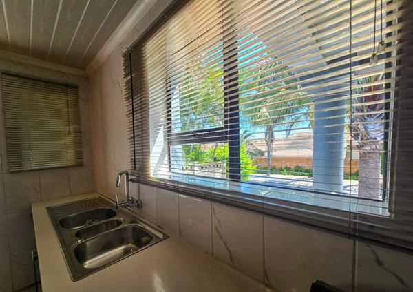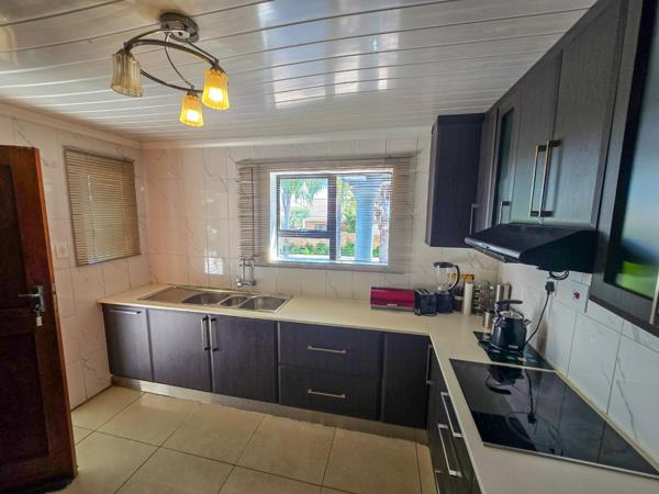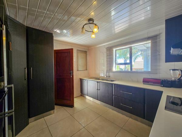 The house boasts three generously-sized bedrooms, each fitted with built-in cupboards and tiled floors, ensuring comfort and practicality. The layout includes two and a half bathrooms, with the main ensuite providing a touch of luxury and privacy. This thoughtful arrangement makes it easy to accommodate family needs while offering guests a separate space to refresh and unwind.