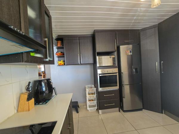As you step inside, you''re greeted by an open-plan lounge adorned with beautifully tiled floors, seamlessly connecting to a spacious dining area. The dining area features a sliding door that opens onto a built-in braai located on an inviting outdoor patio, perfect for entertaining guests or enjoying family gatherings in a relaxed setting. The kitchen is equipped with built-in cupboards, an eye-level oven, and a hob, ensuring both functionality and style as you prepare meals for your loved ones.