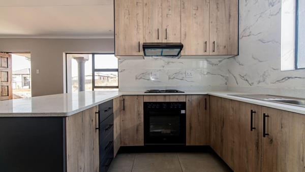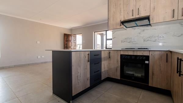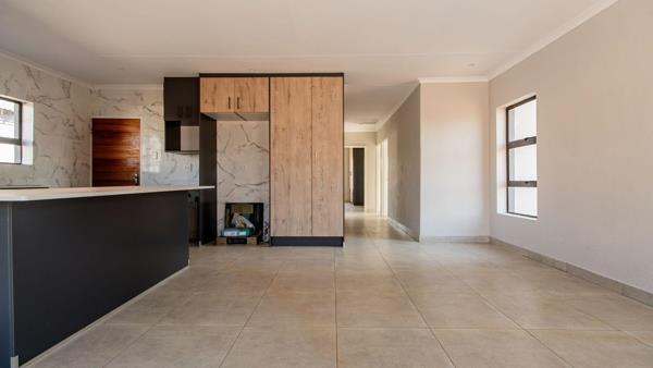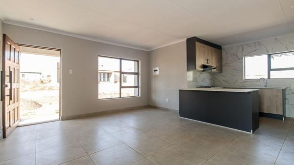 The home features three spacious bedrooms with built-in cupboards and two contemporary bathrooms (of which the main bathroom is en-suite). The open-plan design flows seamlessly from the kitchen into the living area, creating a bright and welcoming space ideal for relaxing or entertaining. The kitchen with its sleek and stylish design boasts a comfortable breakfast nook and dedicated spaces for appliances. Exterior features such as the garden and dedicated parking area are still open ended and can be added by the new owners according to their preference and taste.