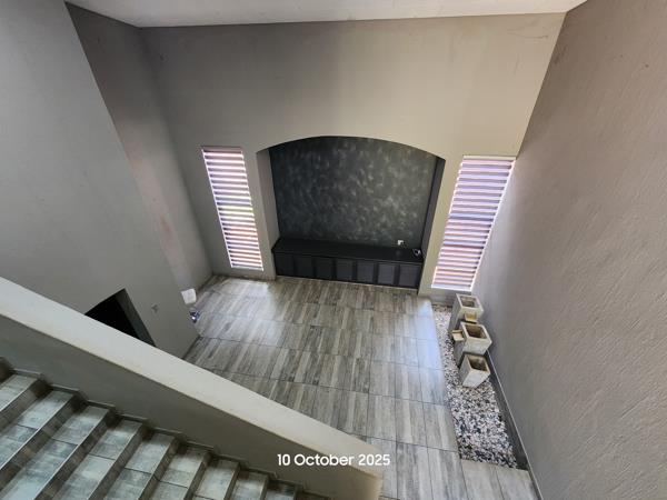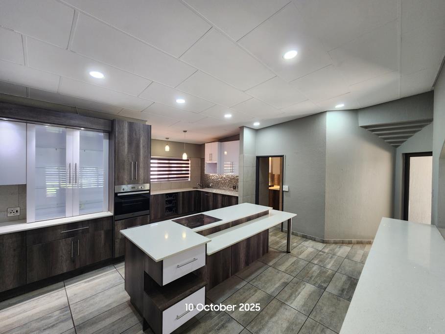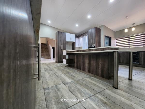 The ground floor hosts four well-appointed bedrooms, each with built-in cupboards and soft carpeting. The upstairs master suite is a private haven, complete with an en-suite bathroom and a flexible area ideal for a lounge or home office. The open-plan kitchen is equipped with an electric hob, pantry, scullery, and laundry, flowing seamlessly into the dining and living areasperfect for entertaining or relaxed family time.