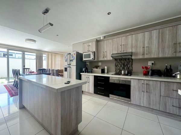 Step into a stylish, fully fitted kitchen featuring sleek built-in cupboards and a separate scullery perfect for seamless meal prep. The open-plan living and dining area flows effortlessly from the kitchen, making it an ideal space for entertaining family and friends.