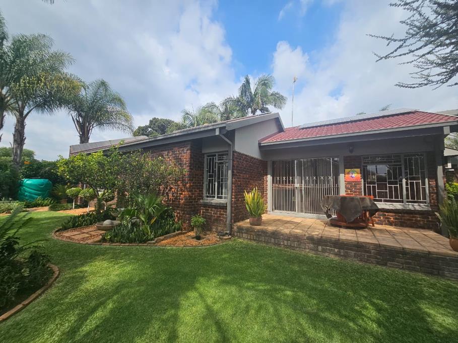 Let us walk you through the property. If you are a fan of golf course worthy grass, well then here is a garden to your standard. The garden is luscious green because of the borehole on the property. The home is also supplied by the borehole. You have a single garage, but you have carports to make up for covered parking for you motor vehicles. Going into the home you have a lovely family living area with an air conditioning unit and the living room opens up onto the beautiful garden. You have a spacious kitchen with a scullery that leads to your entertainment space. You have a closed entertainment space with the built-in braai in arms reach and the beautiful blue pool in sight.